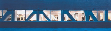 Masonry was removed from the trusses to open the view into the courtyard and to encourage the full integration of library and computer center.